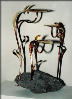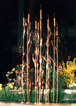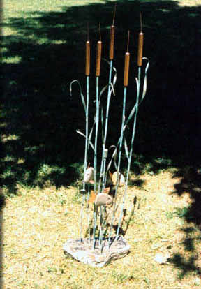 3' tall patinated copper bullrushes. |