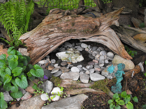 A whimsical fountain for an outdoor water garden this