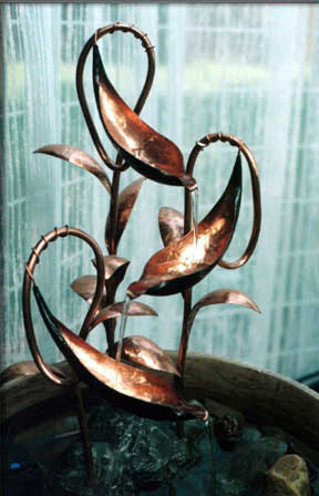 Hand sculpted copper pods cascade the water gently from the