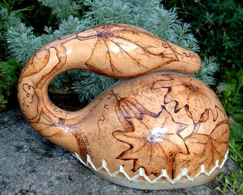 'FLOWER DRUM SONG' pyrography on a swan neck gourd