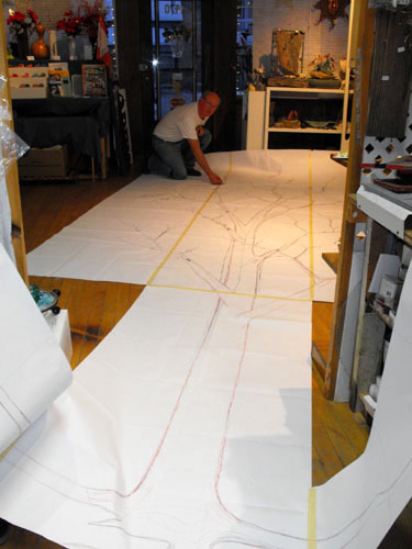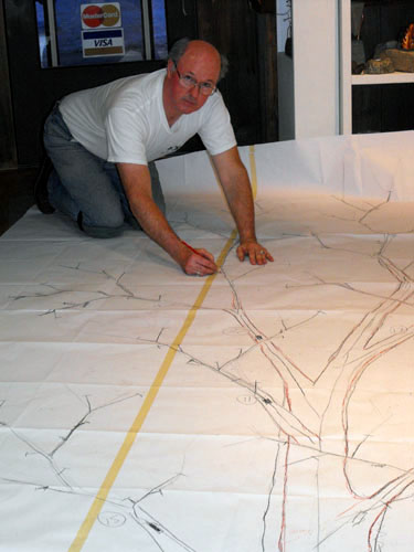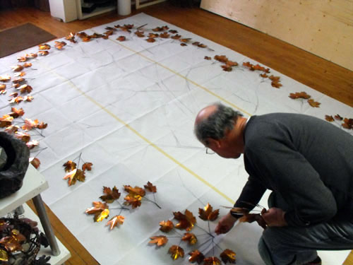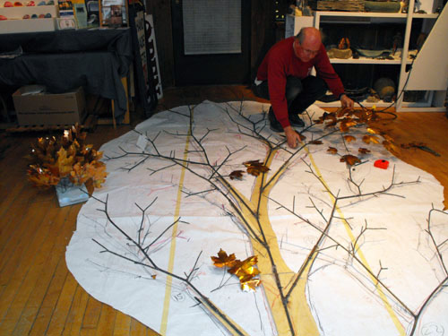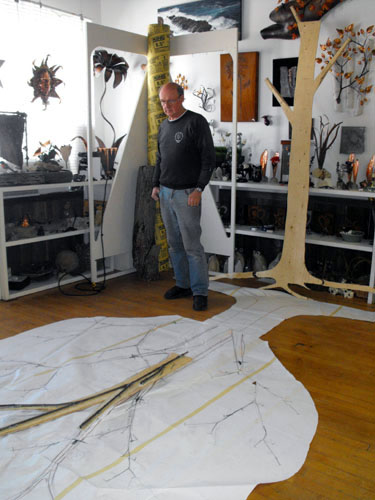 Paul is laying out exactly where the groups of copper leaves will be welded to the steel branches.