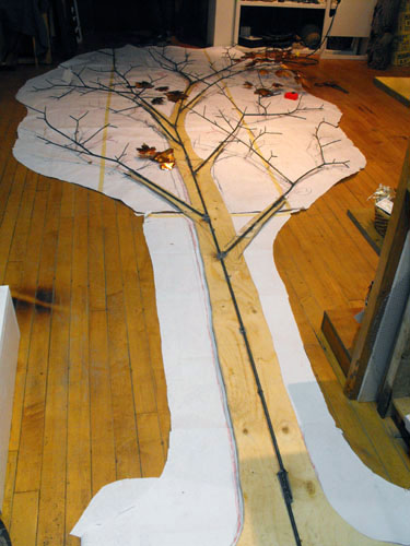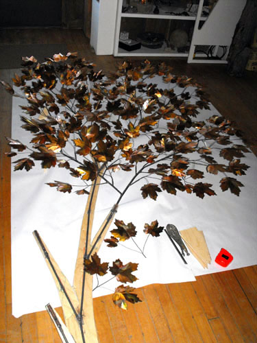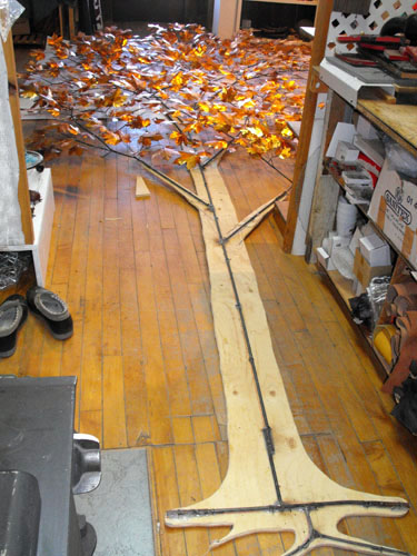 Laying out the pattern of leaves to be attached to a steel branch form.