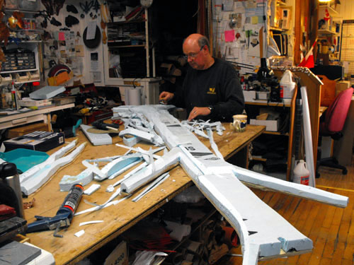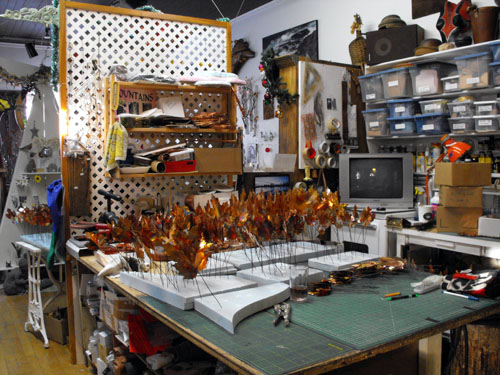 View of Paul's workbench with leaf branch and styrofoam tree trunk.