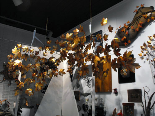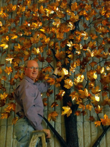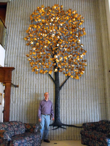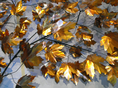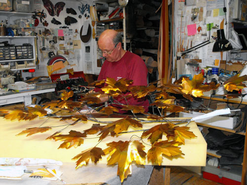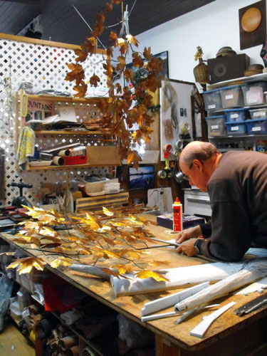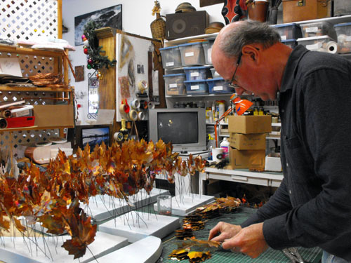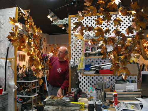 View of Paul putting finishing touches on the copper leaves of the branches.