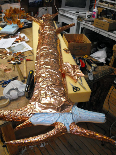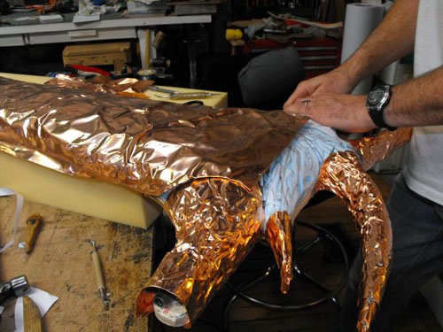 Detail showing Paul adding the rough texture to the copper foil to simulate the texture of tree bark.