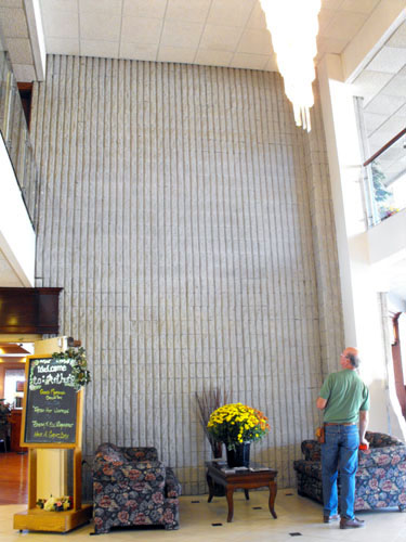 Paul inspecting the 24' wall space where the 18' MAPLE TREE SCULPTURE will be installed at the Best Western Inn, Cobourg.